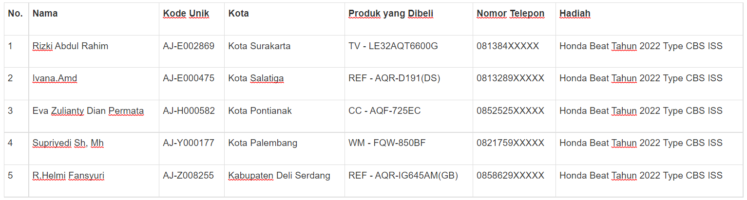Para pemenang undian berasal dari berbagai wilayah yang tersebar di seluruh Indonesia. Sebagai informasi, Promo Big Bang merupakan program promo yang berjalan selama periode 15 Januari – 30 April 2022, melalui promo ini konsumen yang bertransaksi minimal pembelian 3 juta rupiah untuk semua tipe produk Home Appliances berhak mendapatkan 1 kupon Lucky Draw (berlaku kelipatan) yang akan diundi di akhir periode.