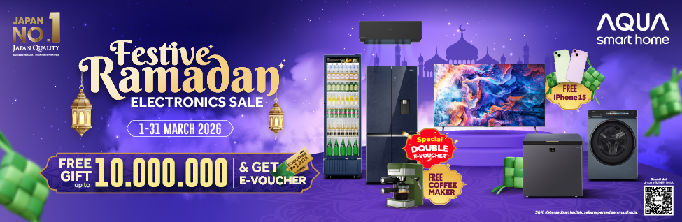 1. Program ‘AQUA FESTIVE RAMADAN ELECTRONICS SALE’ berlaku dari tanggal 1 Maret – 31 Maret 2026 untuk pembelian produk AQUA Elektronik yang terdaftar (daftar terlampir di bawah).
