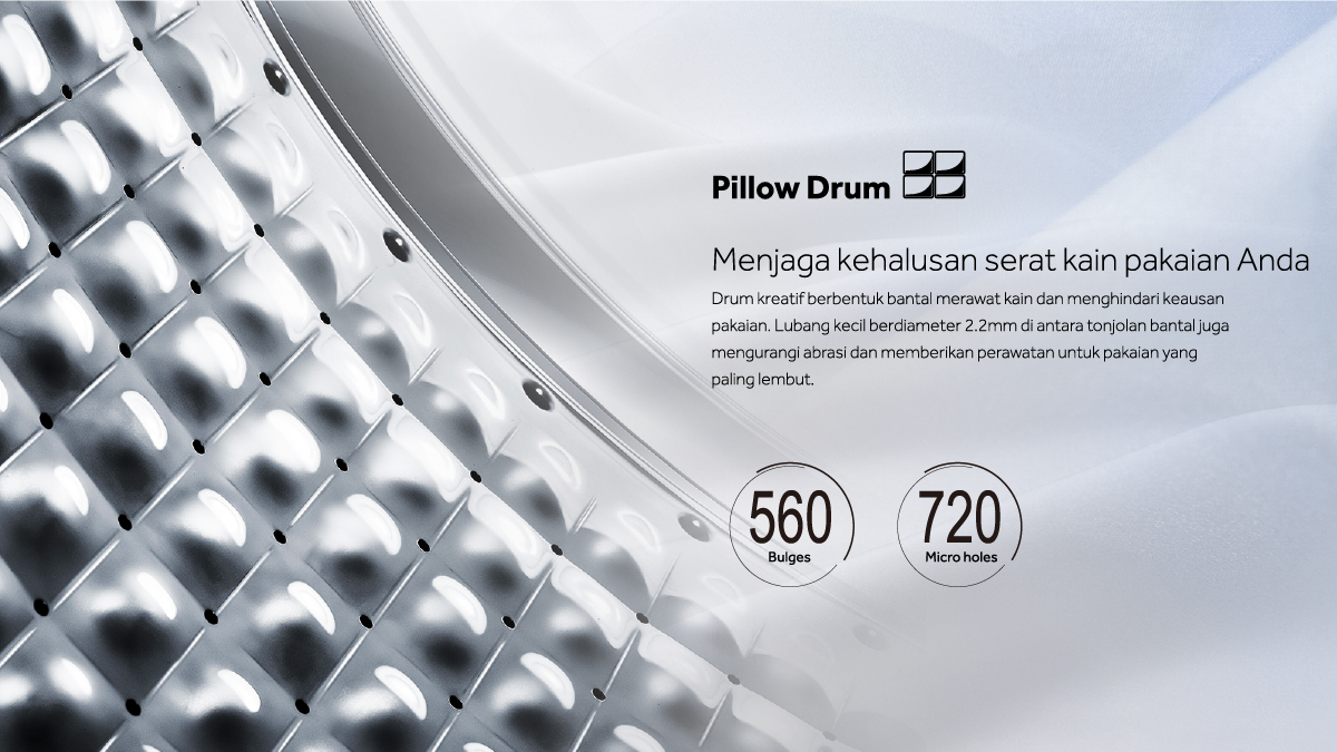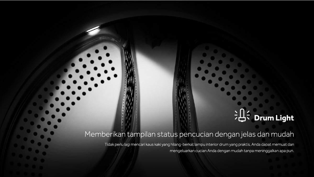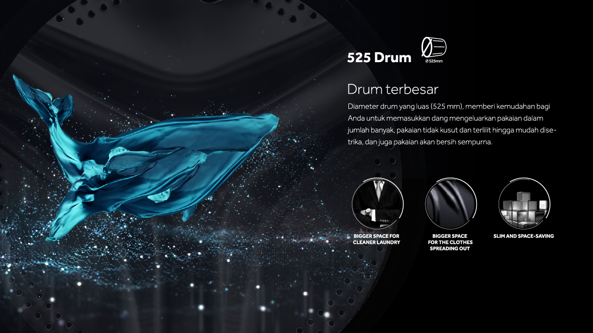 Diameter drum yang luas (525 mm), memberi kemudahan bagi Anda untuk memasukkan pakaian dalam jumlah banyak, pakaian tidak kusut dan terlilit, dan juga pakaian akan bersih sempurna.