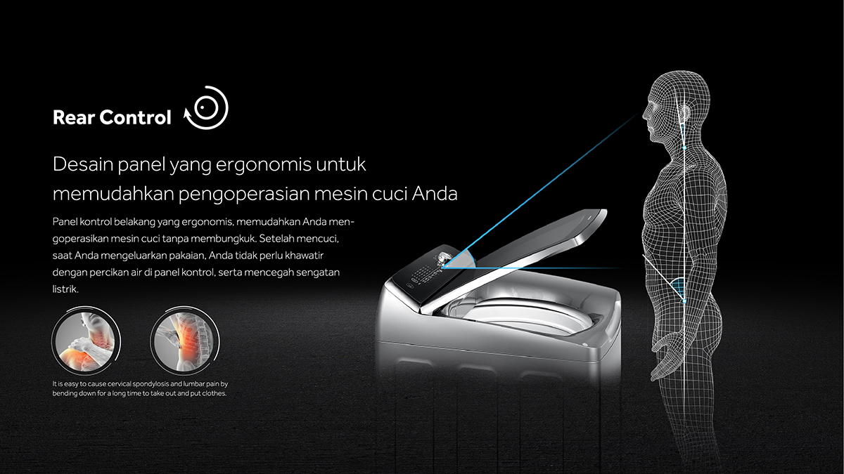 Panel kontrol belakang yang ergonomis, memudahkan Anda mengoperasikan mesin cuci tanpa membungkuk. Setelah mencuci, saat Anda mengeluarkan pakaian, Anda tidak perlu khawatir dengan percikan air di panel kontrol, serta mencegah sengatan listrik.