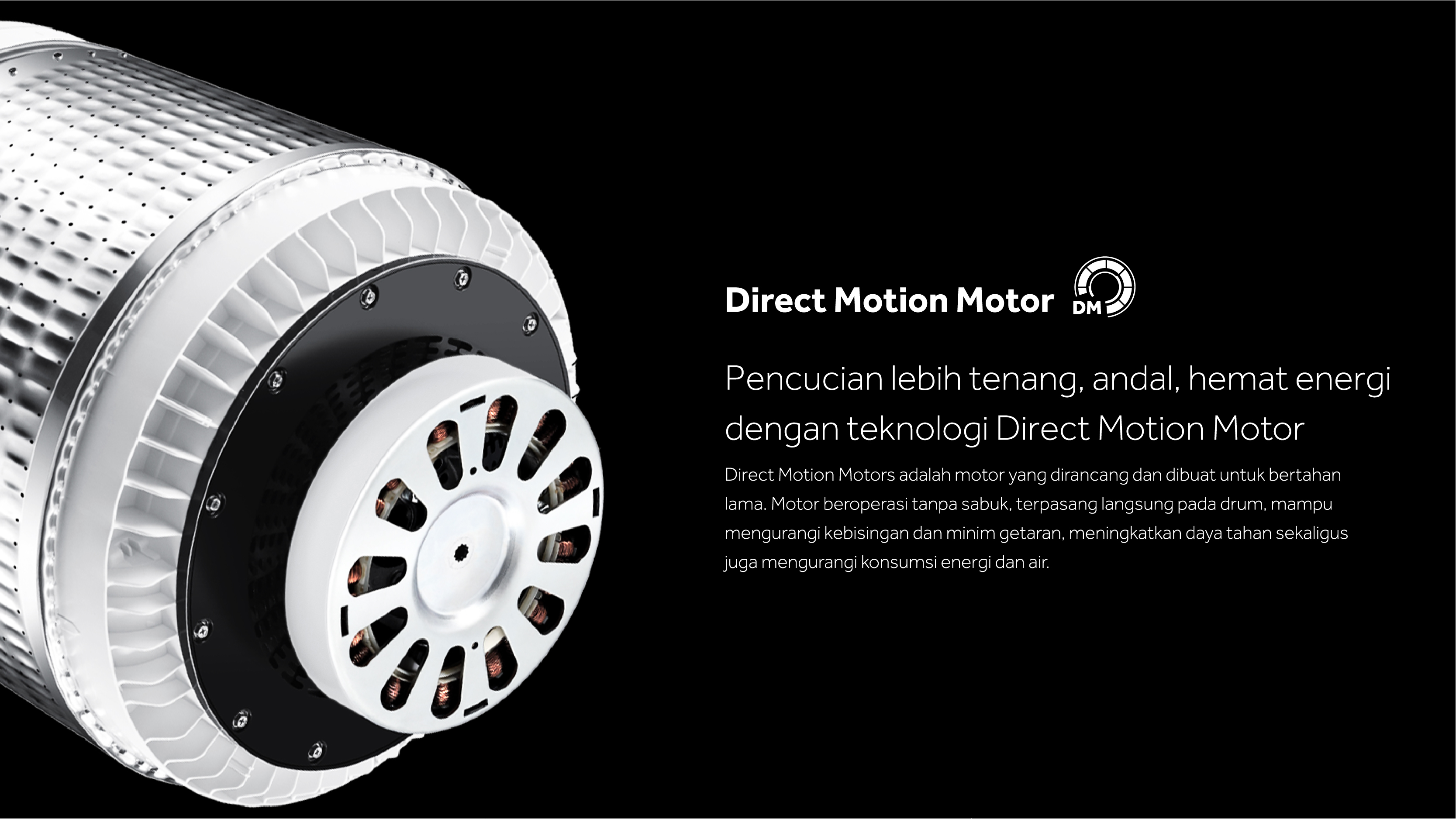 Tanpa sabuk dan katrol, meningkatkan efisiensi dengan menghemat 30% energi. Lebih sedikit gesekan dan lebih sedikit noise yang dihasilkan selama pencucian.