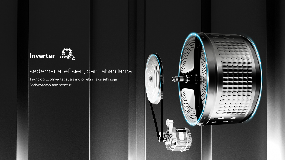 Teknologi Eco Inverter, suara motor lebih halus sehingga Anda nyaman saat mencuci.
