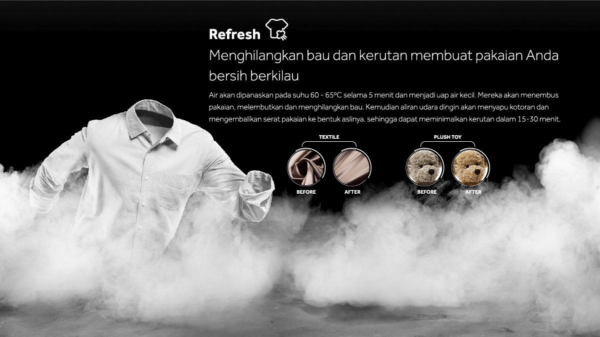 Air akan dipanaskan pada suhu 60 - 65?C selama 5 menit dan menjadi uap air kecil. Mereka akan menembus pakaian, melembutkan dan menghilangkan bau. Kemudian aliran udara dingin akan menyapu kotoran dan mengembalikan serat pakaian ke bentuk aslinya. sehingga dapat meminimalkan kerutan dalam 15-30 menit.