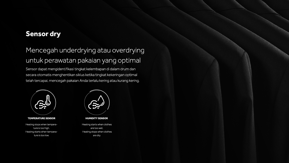 Mencegah underdrying atau overdrying untuk perawatan pakaian yang optimal. Sensor dapat mengidentifikasi tingkat kelembaban di dalam drum dan secara otomatis menghentikan siklus ketika kekeringan optimal telah tercapai. mencegah pakaian Anda terlalu kering atau kurang kering